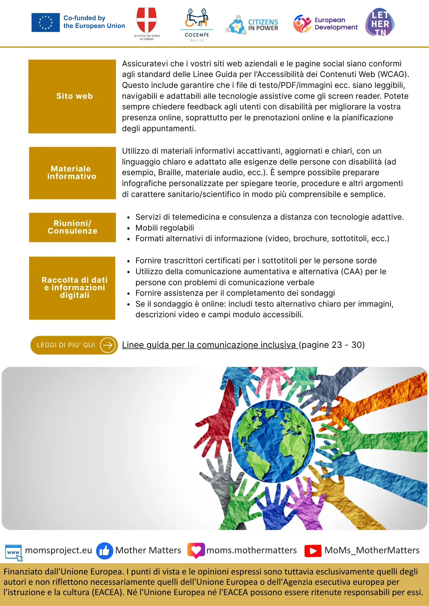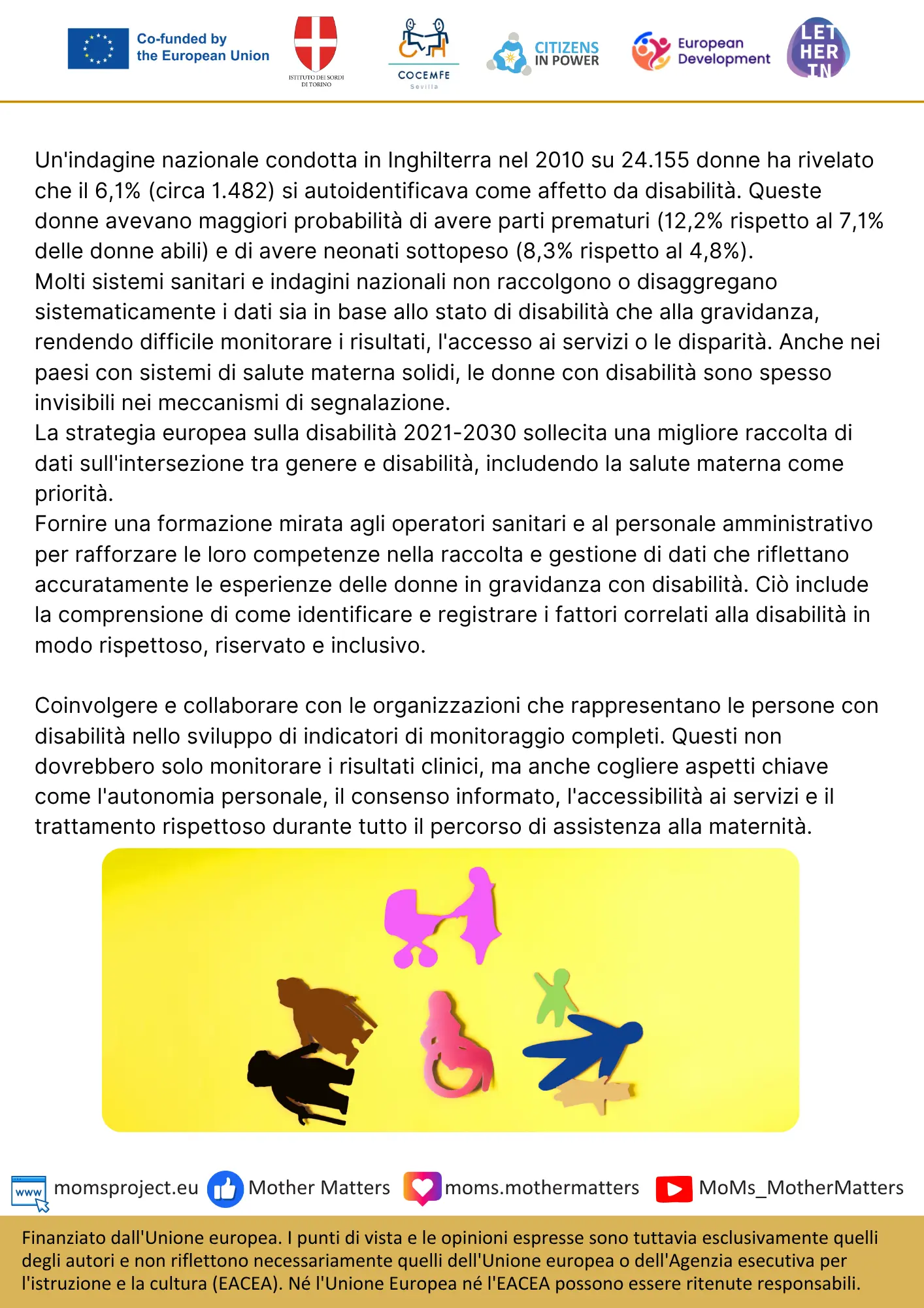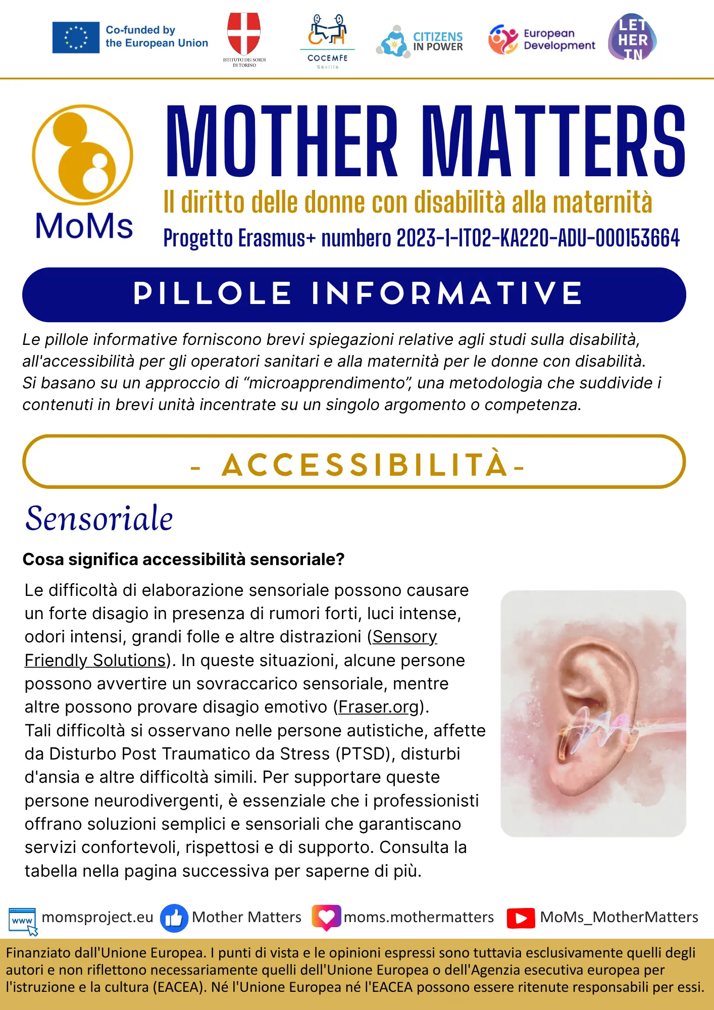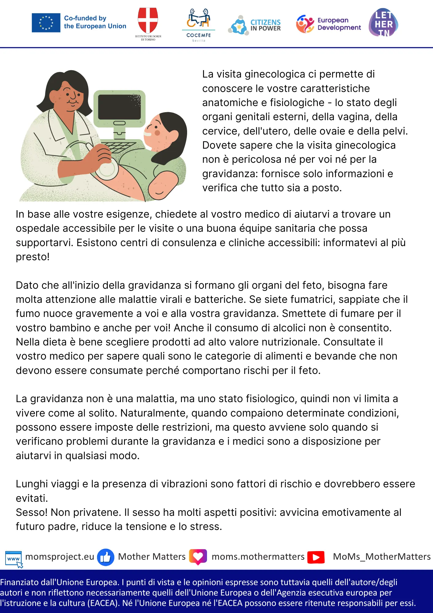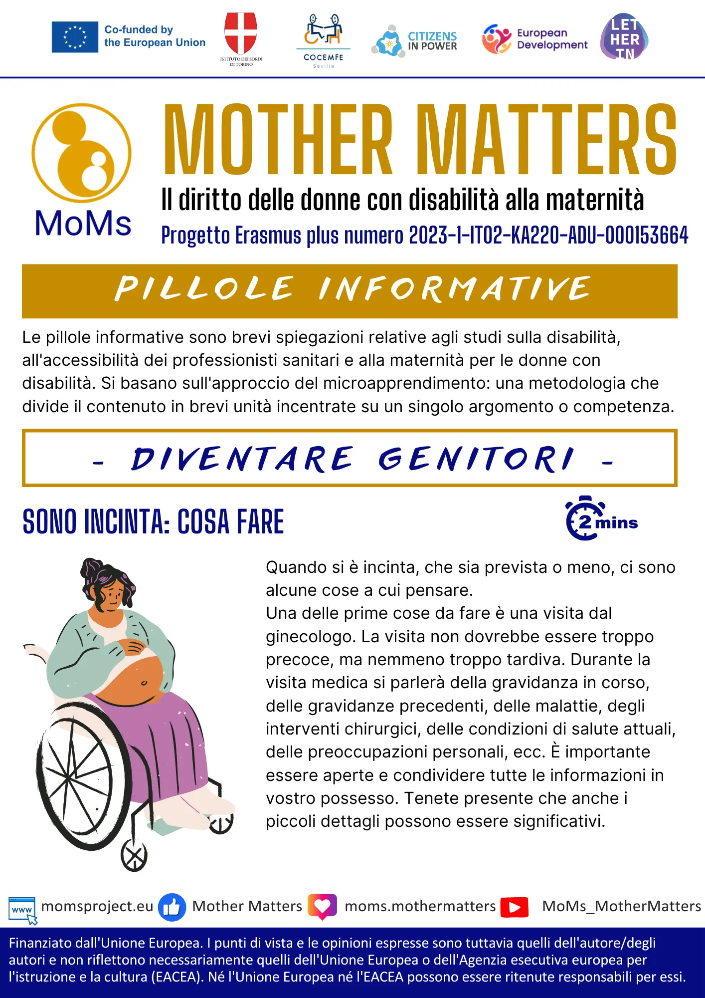 Qui troverai una guida alla maternità. Gli argomenti includono stabilità relazionale, miti sulla gravidanza, rischi, parto e puerperio. Presto troverai anche consigli per il design universale e video nelle Lingue dei Segni!